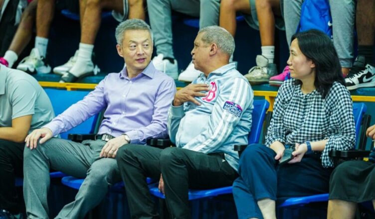 El embajador de China, Luning, realizó el saque de honor junto a José Domínguez (Boyón), Junior Páez (Yipi), directivo de la Federación Dominicana de Baloncesto y Leo Corporán, asesor del Club Mauricio Báez.