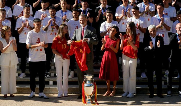 La primera parada fue el Palacio de la Zarzuela donde el rey Felipe VI, la reina Letizia, la princesa Leonor y la infanta Sofía (estas vestidas con la camiseta de España) acogieron a los 26 futbolistas y el cuerpo técnico de España. Un acto que sirvió como homenaje a una generación que ya ha escrito con letras doradas la historia del fútbol español.