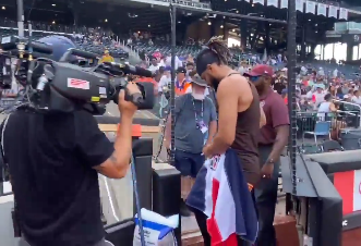 Un video muestra al jugador de los Padres de San Diego compartiendo con los fanáticos. Estos le lanzan objetos al campo para que éste los firme. En ese interín, uno de los fanáticos intenta lanzarle una bandera dominicana, pero él lo detiene y se acerca para tomarla y evitar que lanzaran la insignia de identidad del pueblo dominicano.