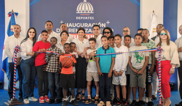 La vicepresidenta Raquel Peña y el ministro Kelvin Cruz, acompañados por la gobernadora Severina Gil, el alcalde Frank Rodríguez, niños baloncestistas y otras autoridades de la provincia, realizan el corte de la cinta para dejar formalmente remozado el Polideportivo de Loma de Cabrera.