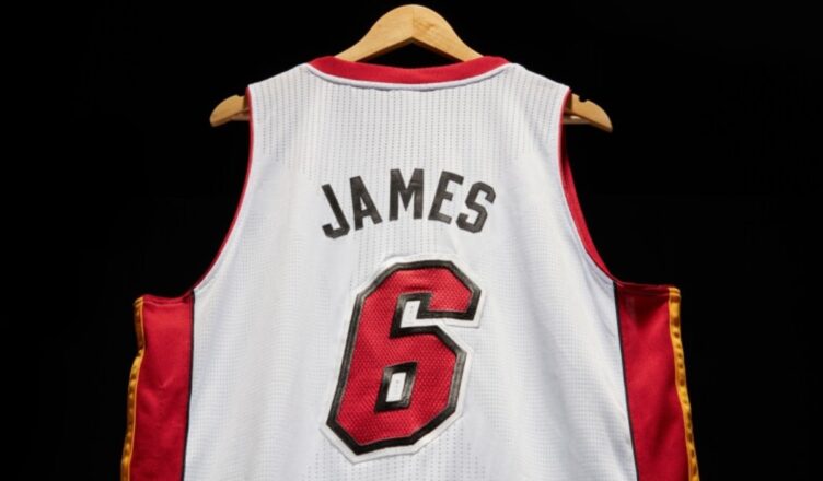 La camiseta de color blanco tiene el dorsal 6 que James usó en Miami, equipo que dejaría al término de la siguiente temporada tras caer en las finales ante los